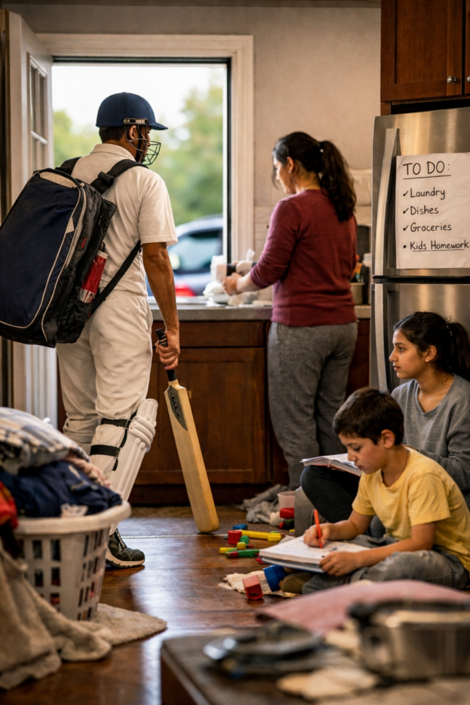 For years I tried explaining this imbalance. Not dramatically, just honestly. I explained how exhausting those mornings can be when the alarm rings at six and the sky outside is still black with cold. I explained how strange it feels when both partners contribute almost equally to the income but only one partner carries the mental infrastructure of family life. Conversations happened. Understanding appeared for a moment. And then the pattern returned. Weekends came again, the cricket bag appeared again, and life continued exactly as before.